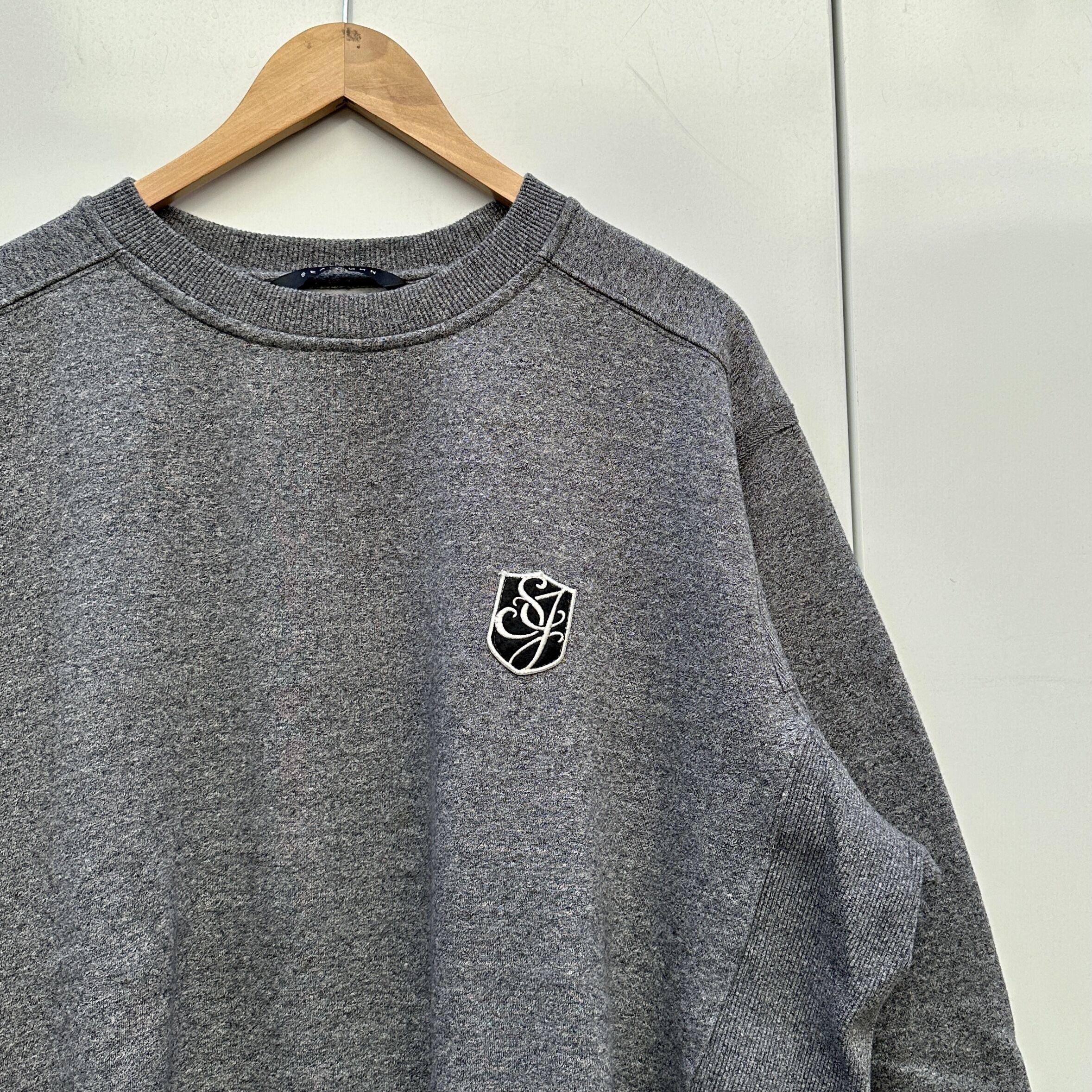 杢グレーの裏起毛素材、左胸にSJロゴワッペンが付いたシンプルデザインです。