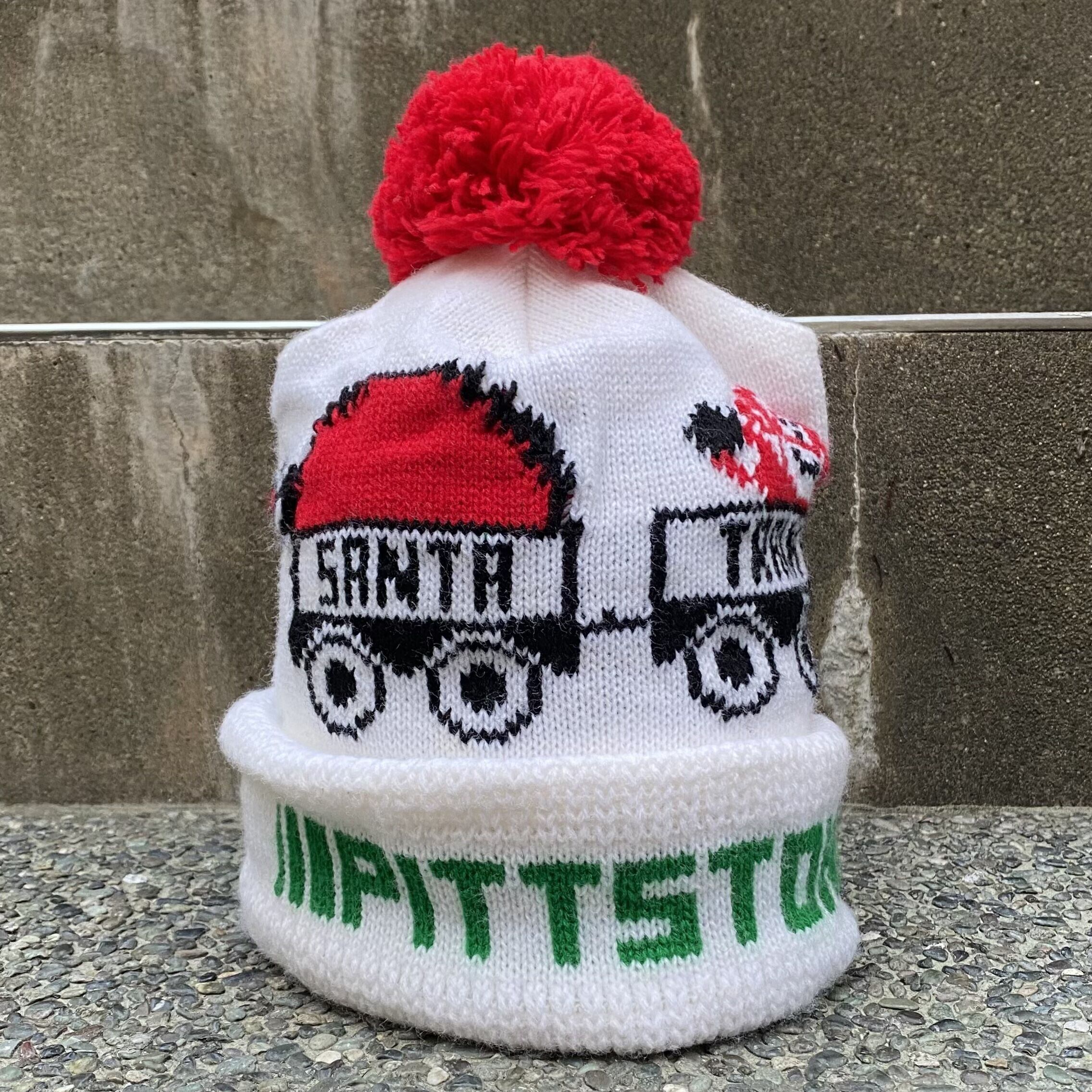 ホワイトxグリーン/ブラック/レッドのアクリル素材、PITTSTONとSANTA TRAIN柄が織柄で入り、天にボンボンが付いたデザインです。
