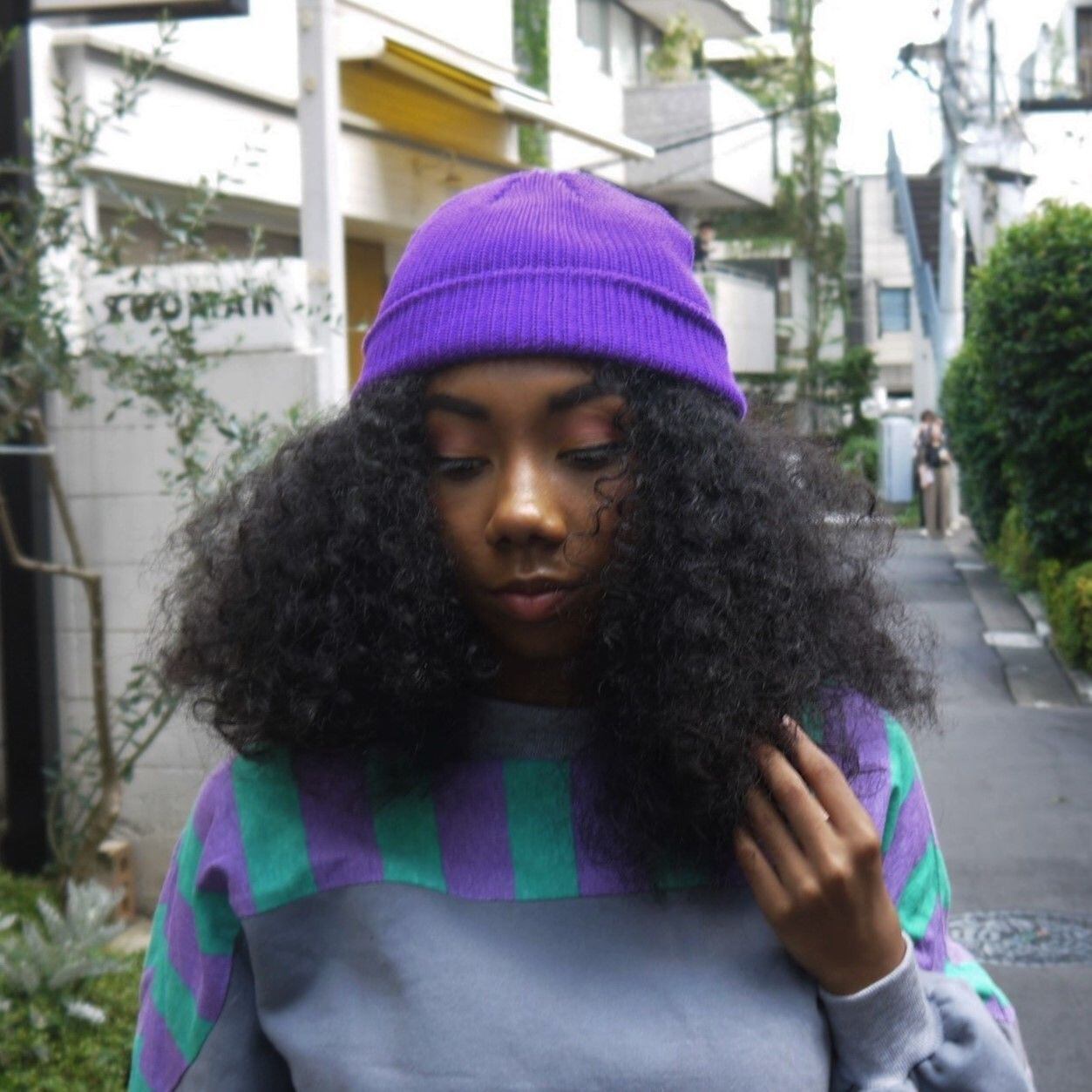 アクリルコットンの柔らかな素材で、耳を出して浅く被れるシルエットになります。