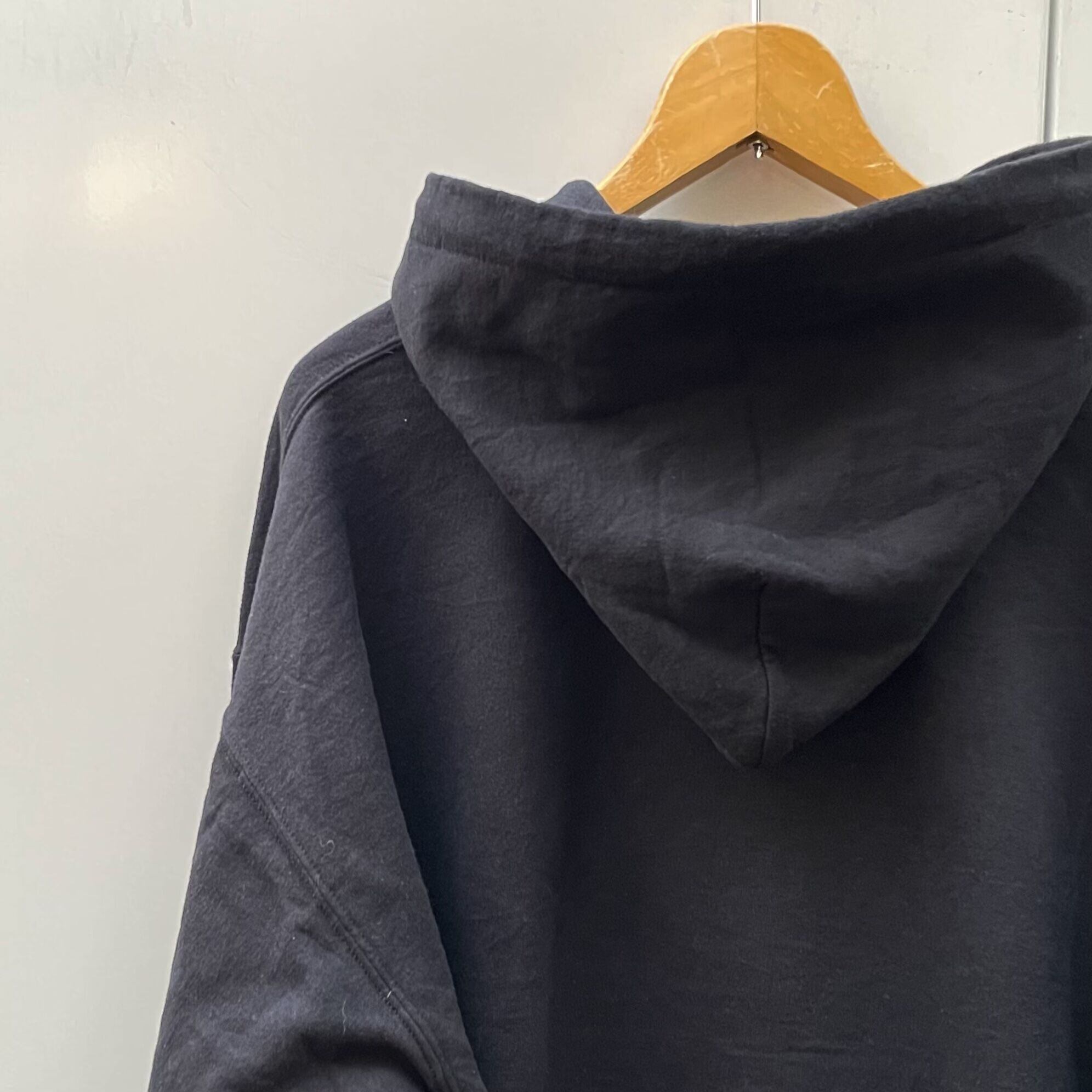 ブラックの裏起毛ボディ、フロントにロゴプリントが入るシンプルデザインです。
