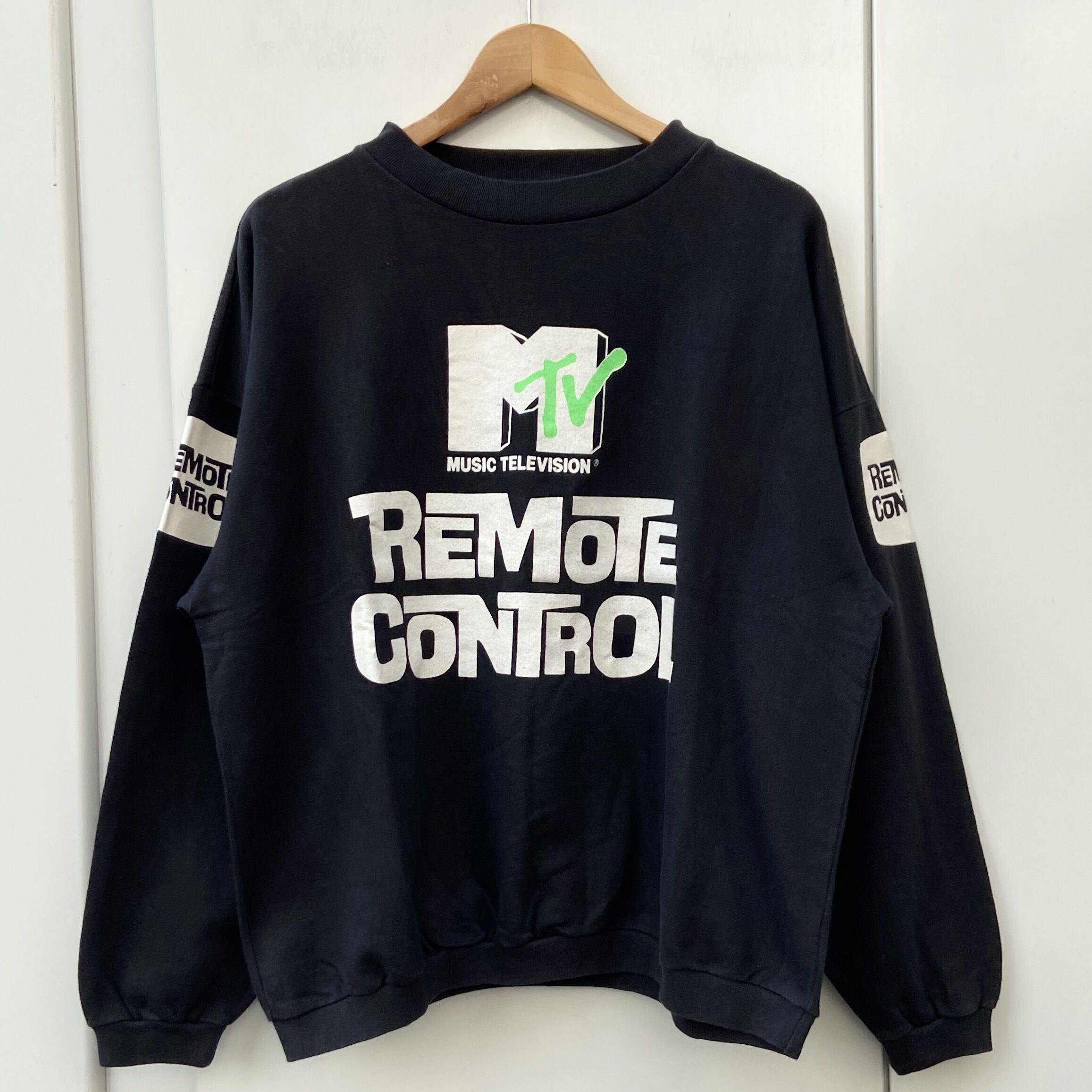 ブラックの裏毛素材、フロントにMTVロゴとREMOTE CONTROL プリント、両袖にREMOTE CONTROL ロゴがプリントされたデザインです。