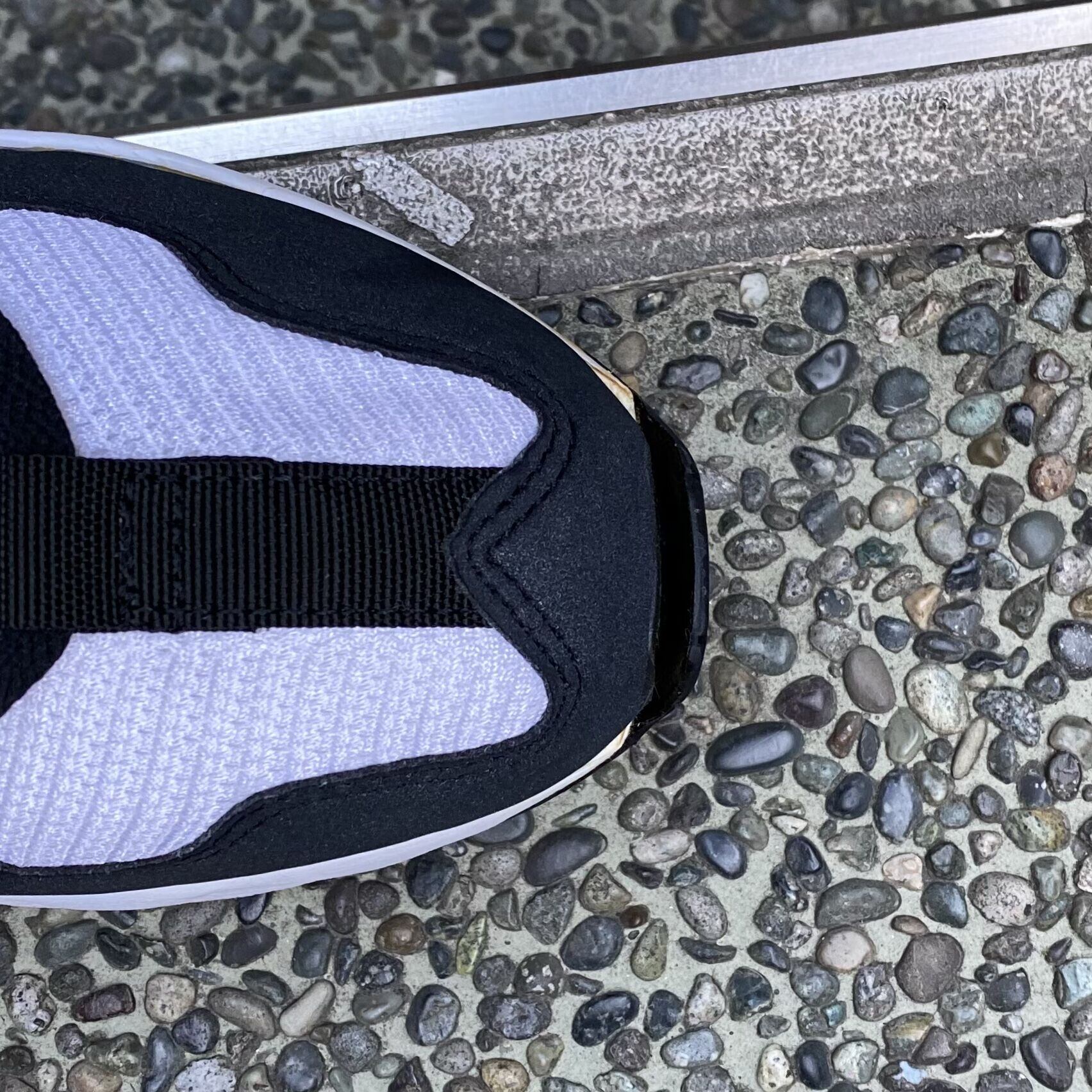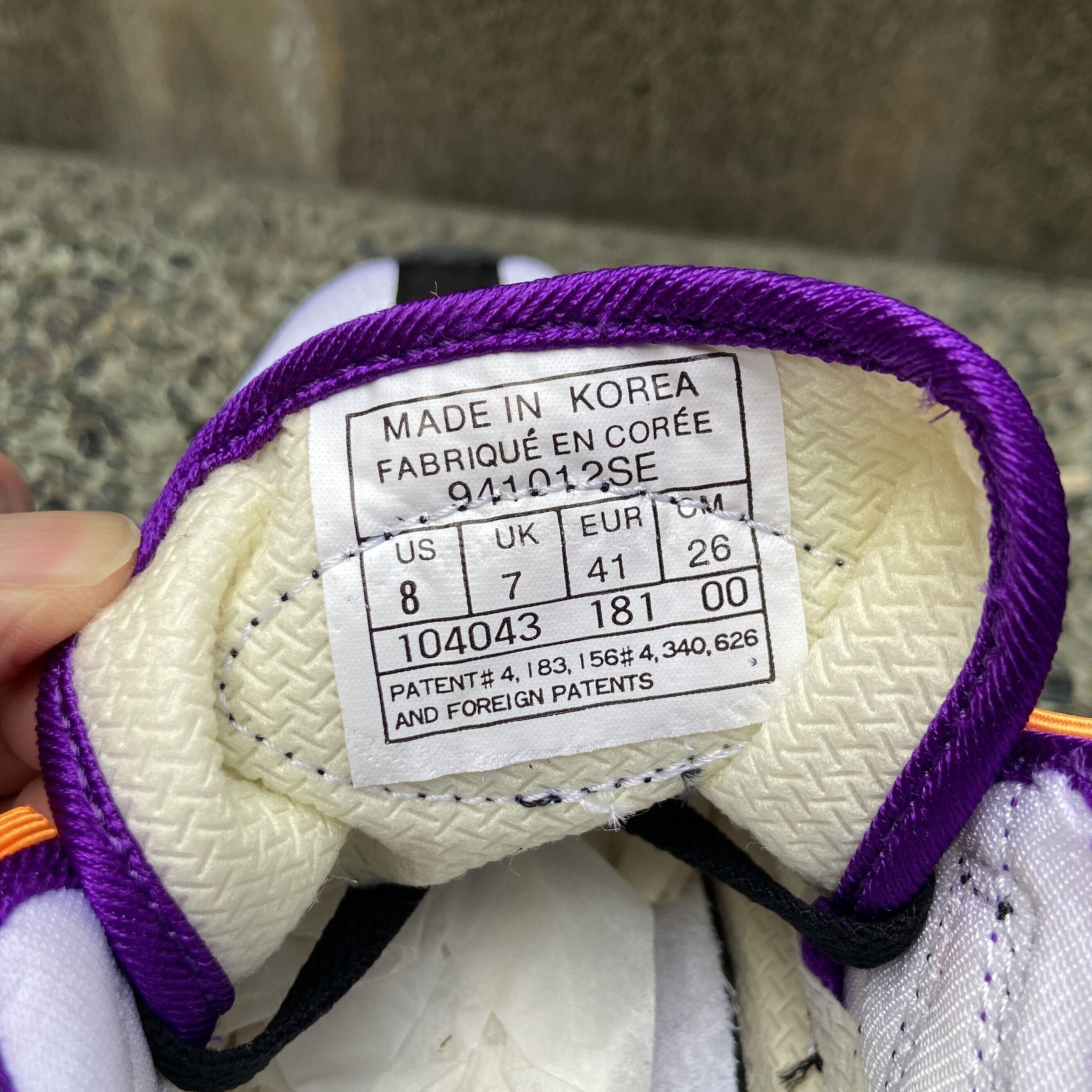 ブラックxホワイトxパープルxオレンジ、メッシュxラメ入りのウレタンアッパー、レースは外付け一体型のデザインです。