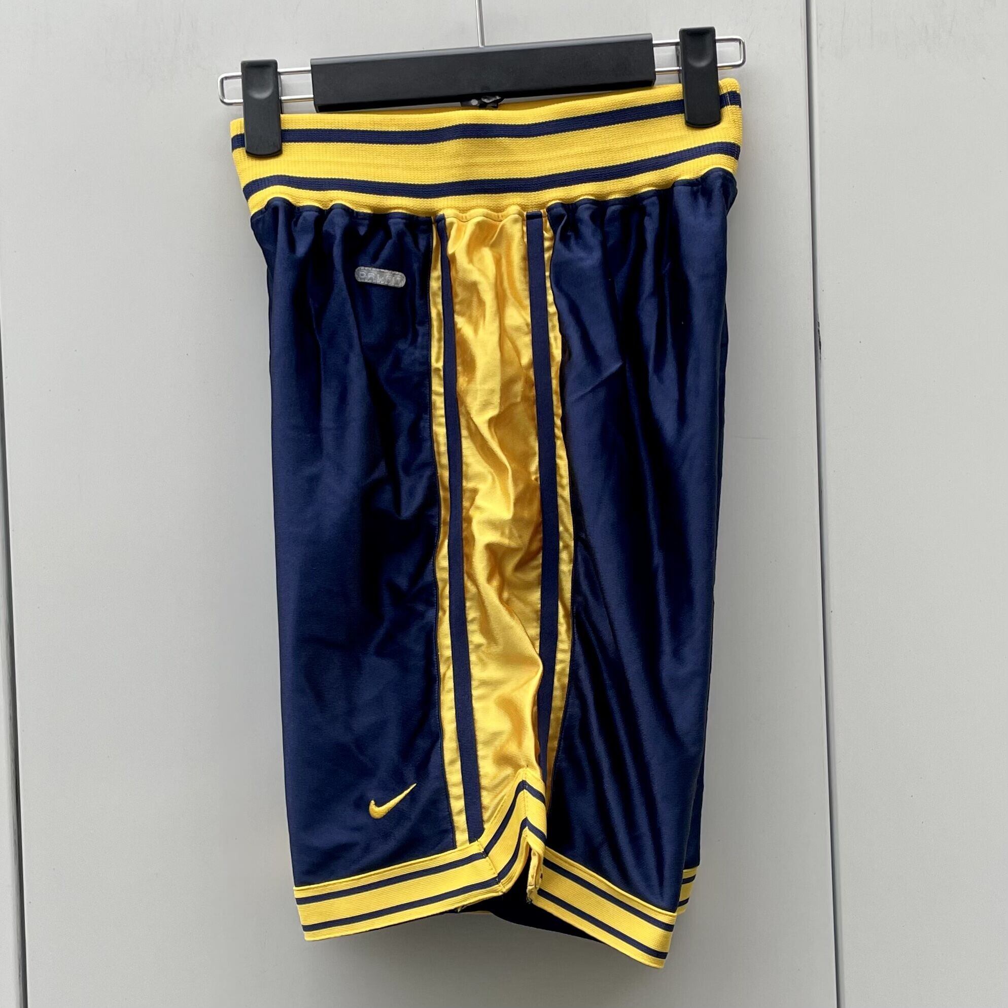 ネイビーxイエローのサテン系素材、左足にスウォッシュ刺繍、ポケットは無くバスケットで使用するタイプのデザインです。