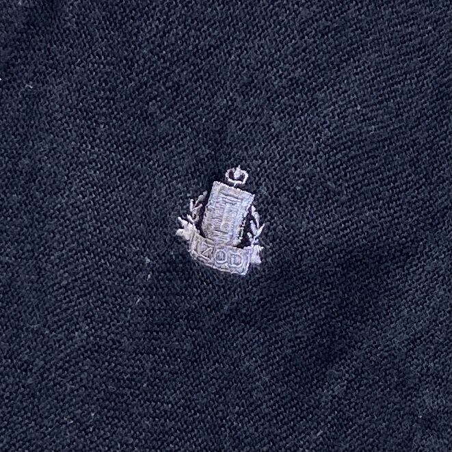 ブラックのニット素材、左胸にロゴ刺繍、6ボタンのスタンダードデザインです。