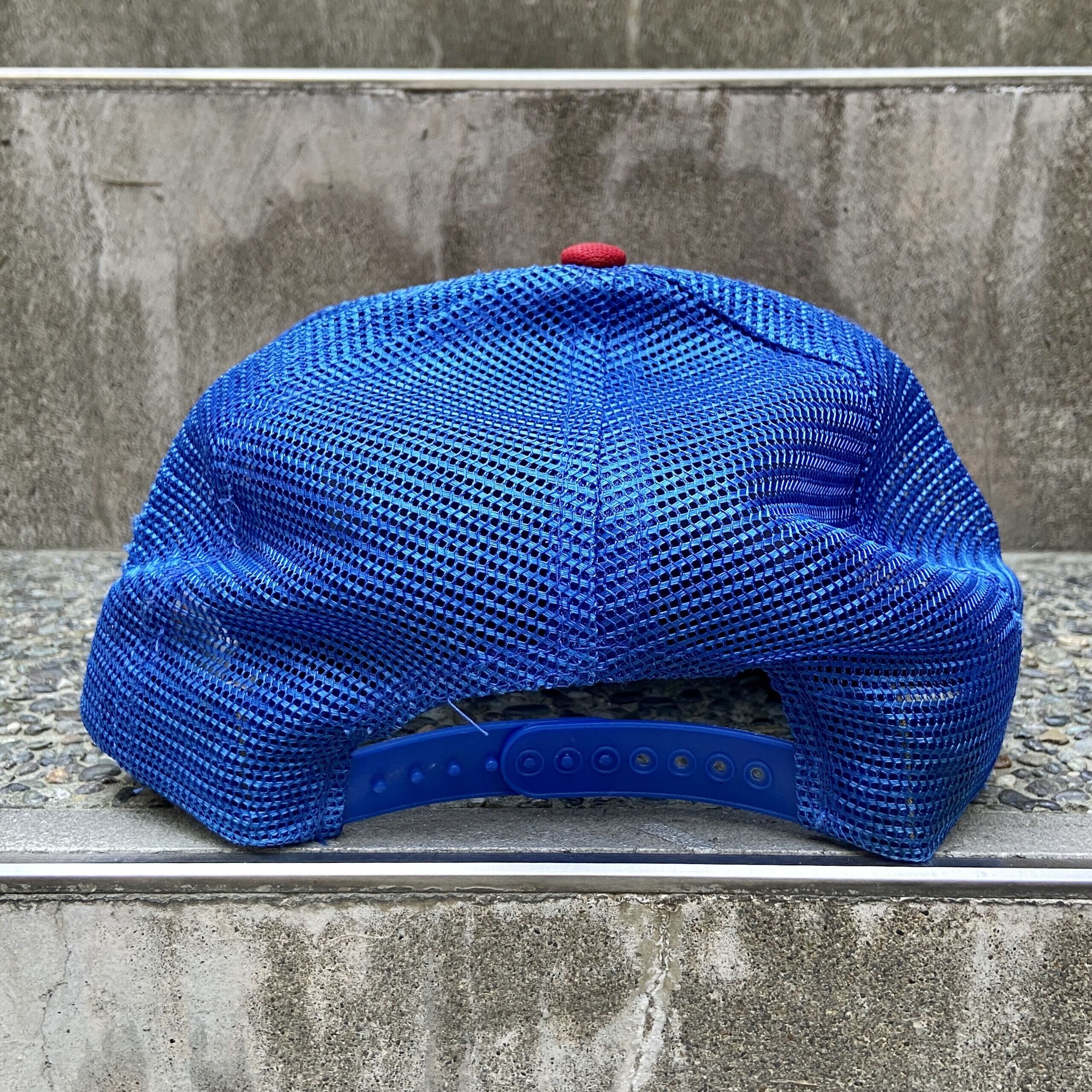 ブルーxレッドのメッシュ、正面にロゴマーク刺繍が入るシンプルデザインです。