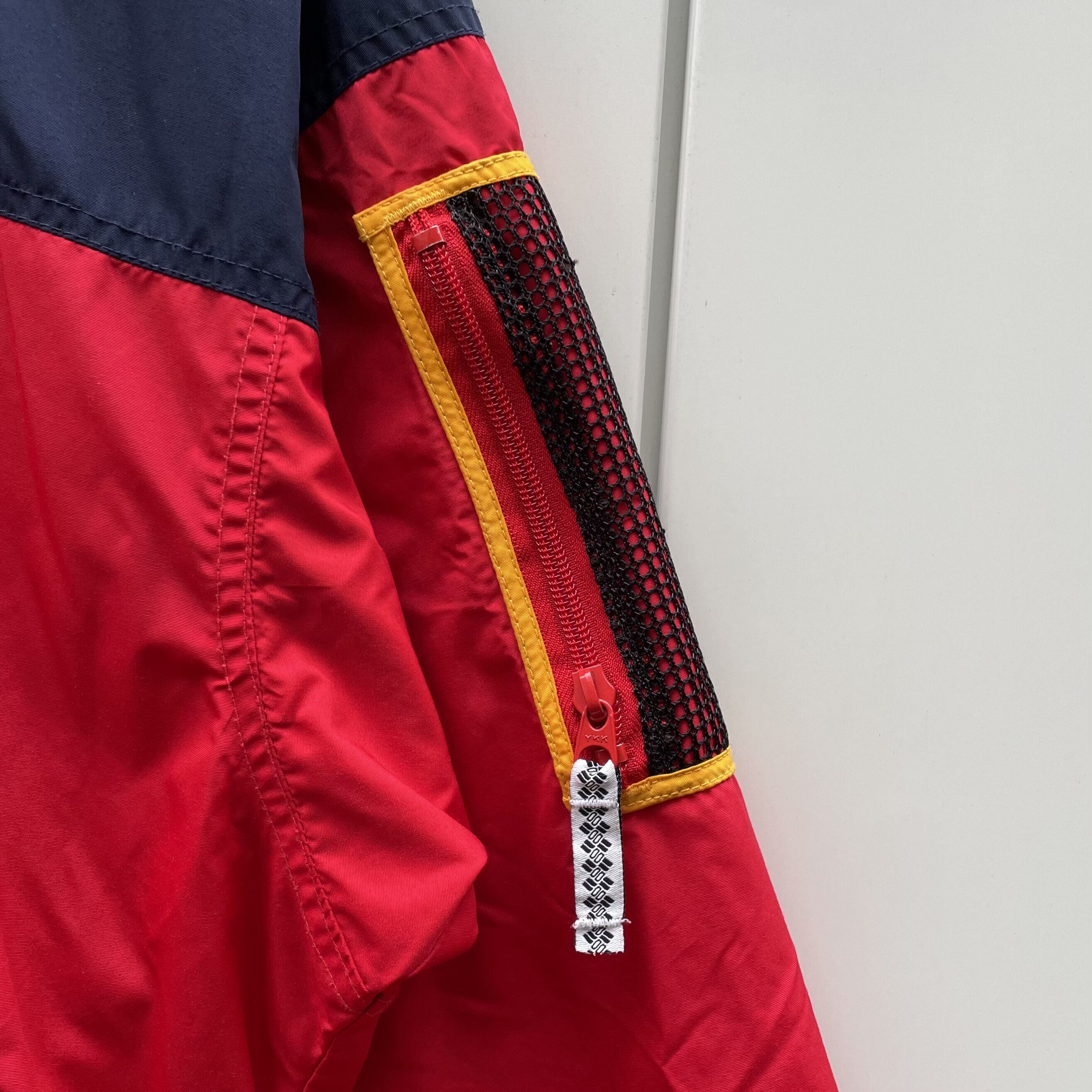 レッドxネイビーxイエローのナイロン素材、フロントに大きなフラップポケットにロゴ刺繍、左袖にメッシュポケットとラバーのロゴが付いたハーフジップのパーカーデザインです。