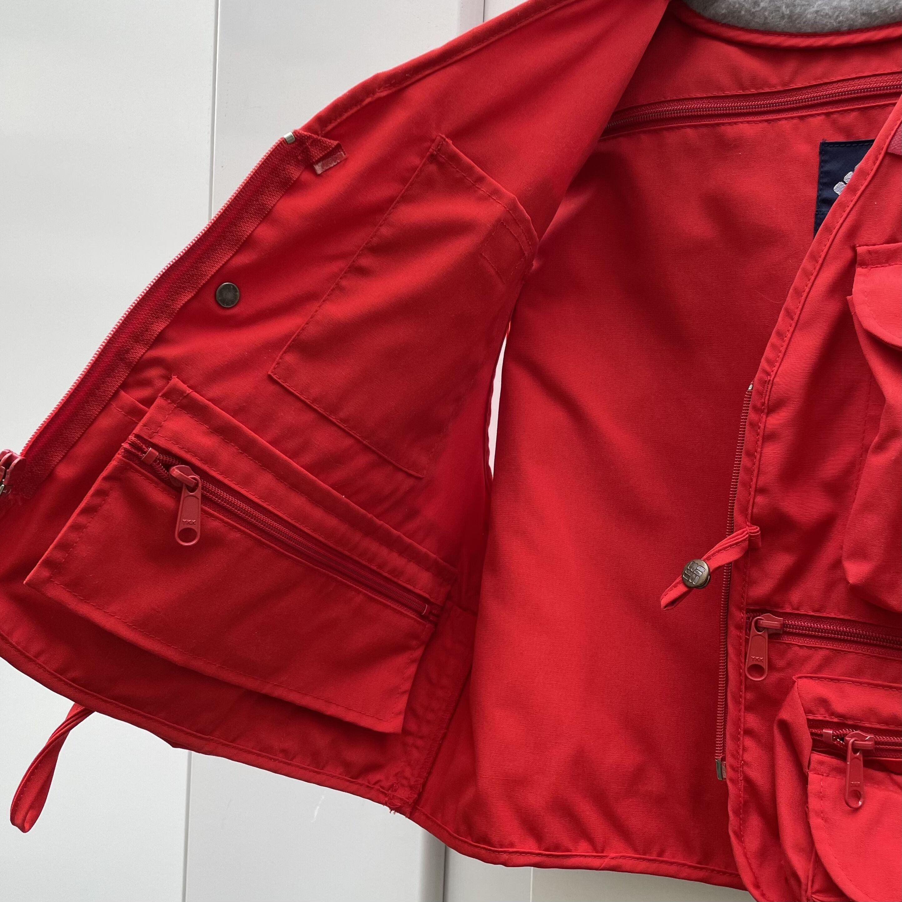 レッドの60/40クロス、ポケットが沢山付き、釣り針を引っかける事が出来るなど本格的なデザインです。