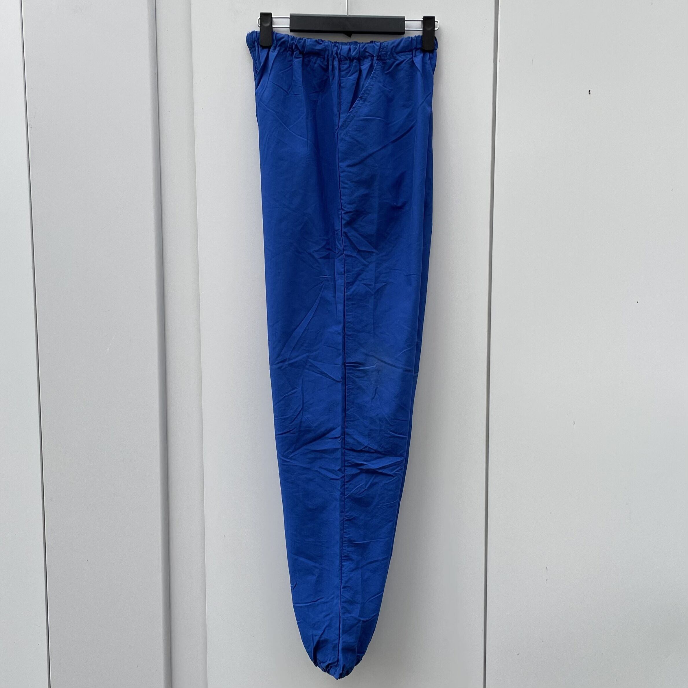 ブルーのナイロン素材、ロゴなどは無く、両サイドにポケットと左サイドポケット、裾にゴムが入るデザインです。