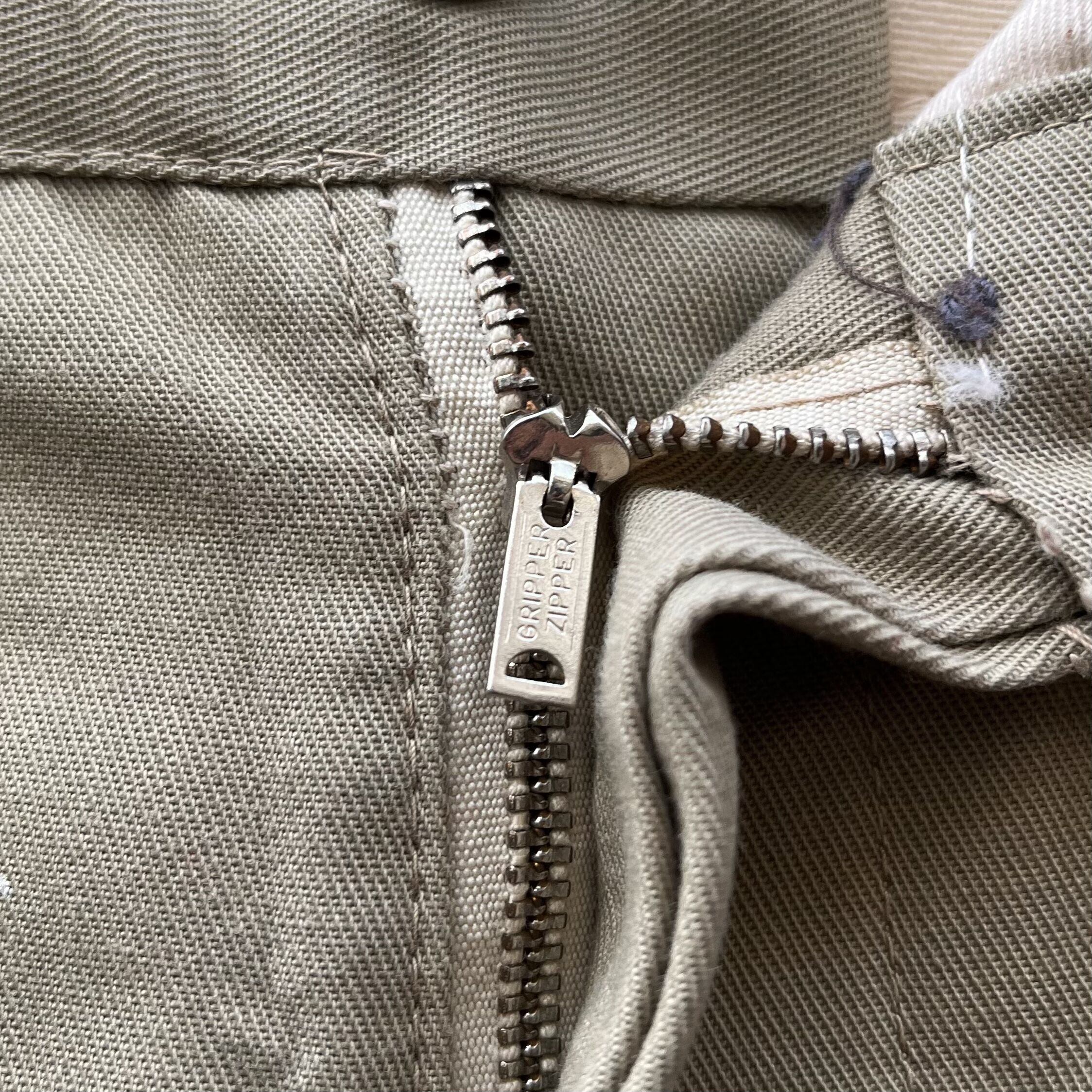 ベージュのポリエステル混系チノクロス、ノータックの5ポケット、グリッパージッパー、当時のスタンダードデザインです。