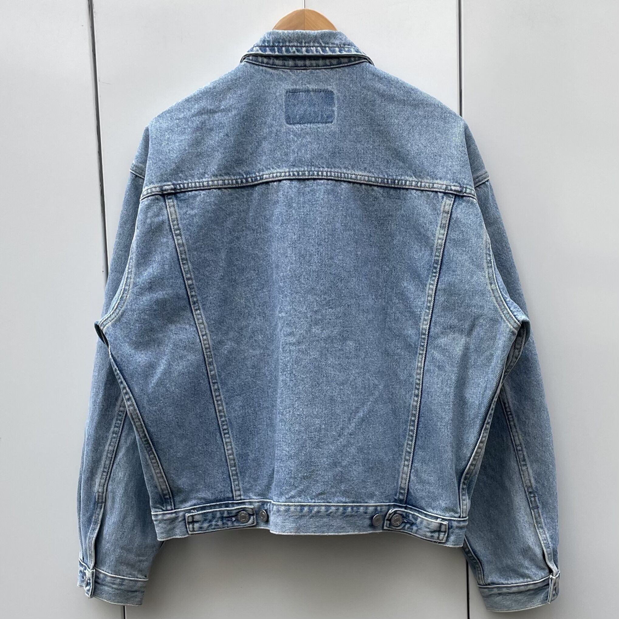 ウォッシュドブルーデニム、ロゴ入りボタン、ハンドウォームポケットの付いたシンプルデザインです。