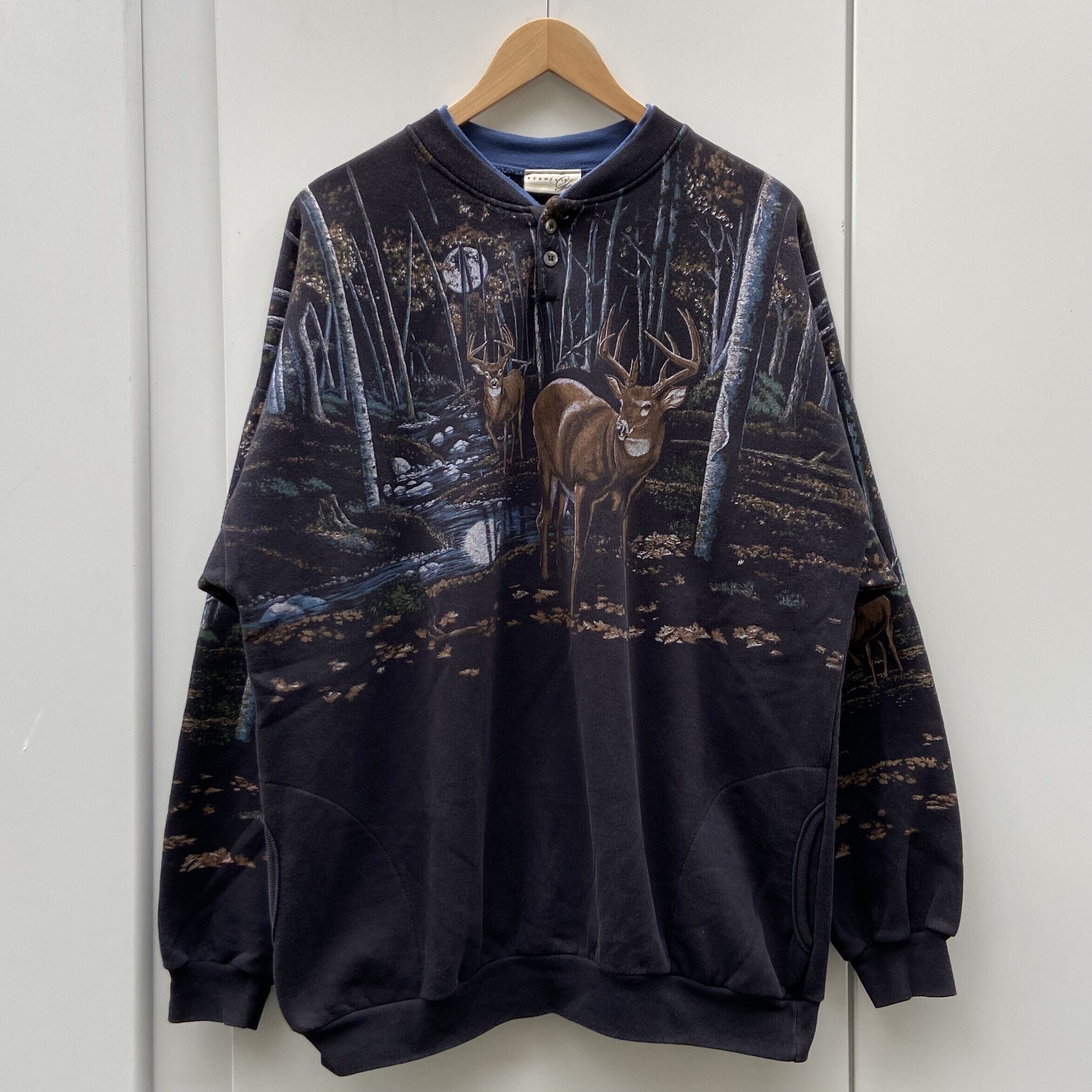 ブラックxブルーグレー裏起毛素材、ヘンリーネックの2重襟、両面両袖に森林と鹿の絵が描かれたデザインです。