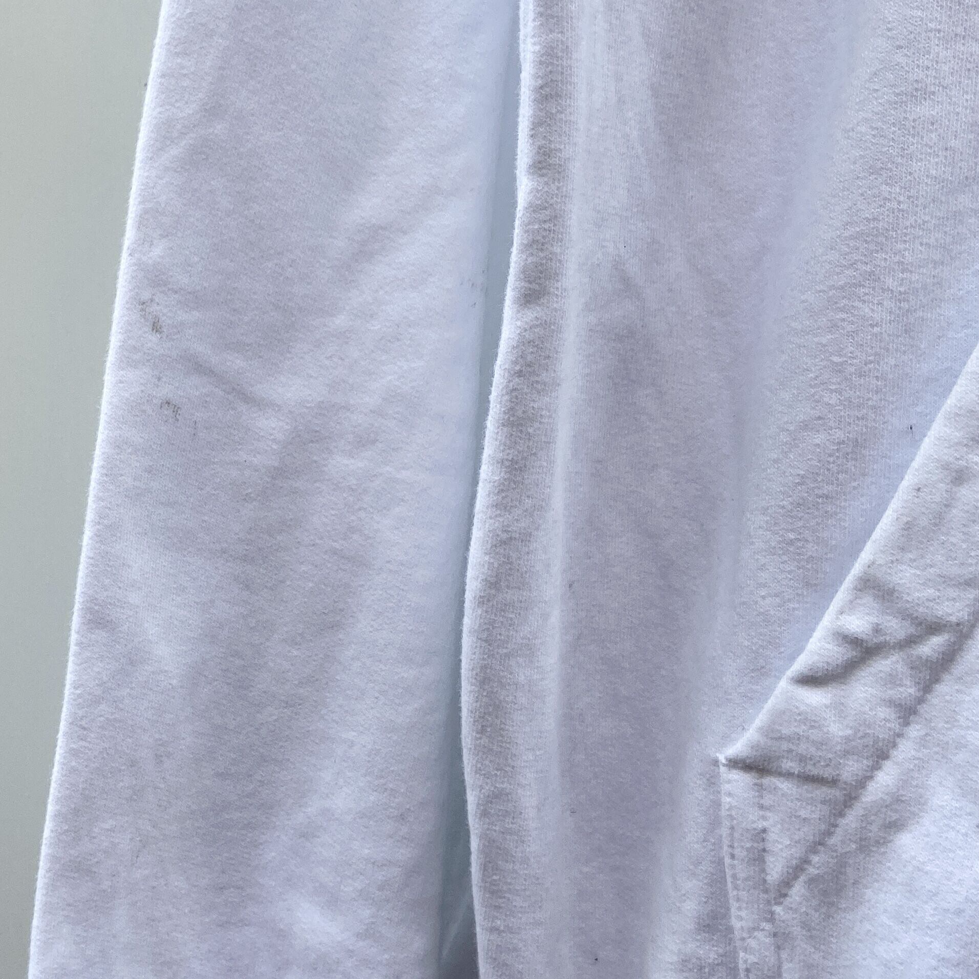 ホワイトのコットン裏起毛ボディ、フロントに大きくトレフォイルマークが刺繍されたシンプルデザインです。