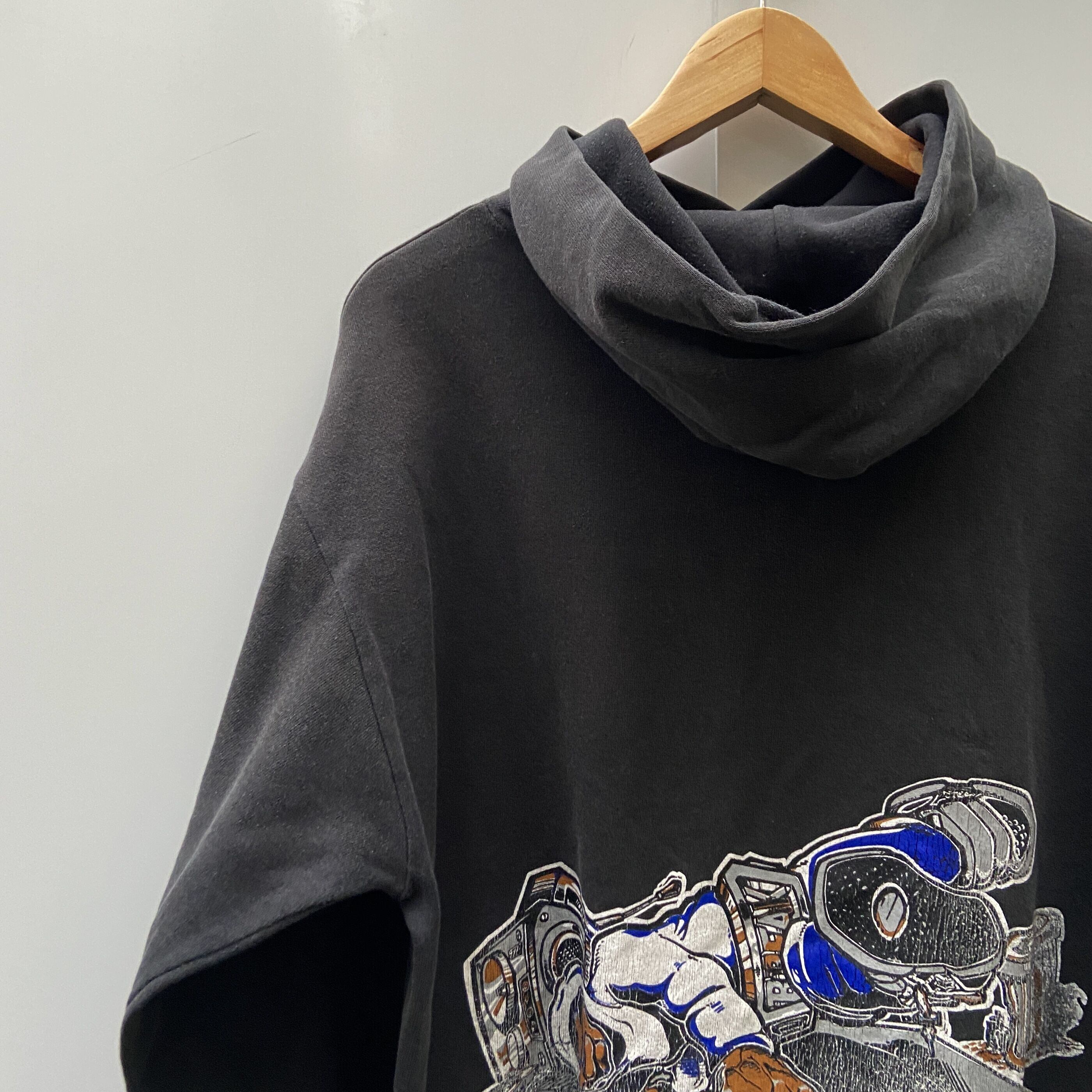 ブラックの裏起毛素材、左胸とバックにグラフィックがプリントされた当時らしいデザインです。