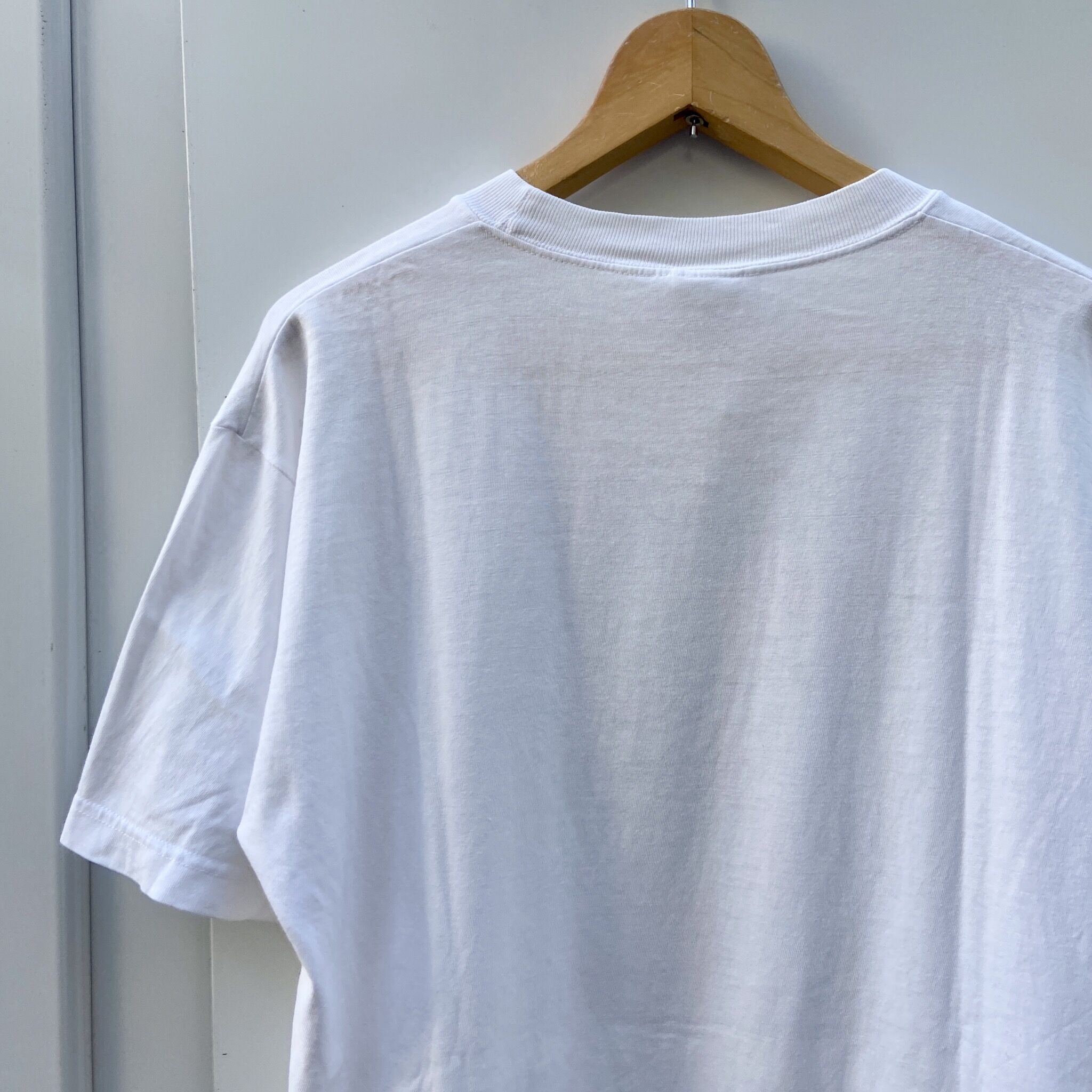 フロントの左下とプリント左脇、バック中央付近に幾つかのシミ、Tシャツのネジレが見られます。その他着用感が見られますが、目立ったヨゴレやダメージは見受けられません。