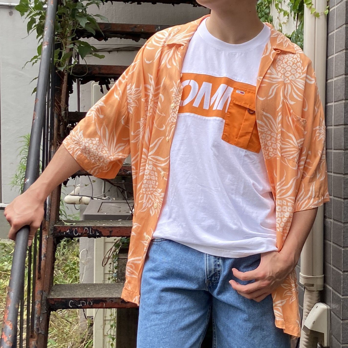 恐らく抜染プリントをしようしていて、ビンテージ同様の雰囲気に仕上がったアロハシャツと言えるでしょう。