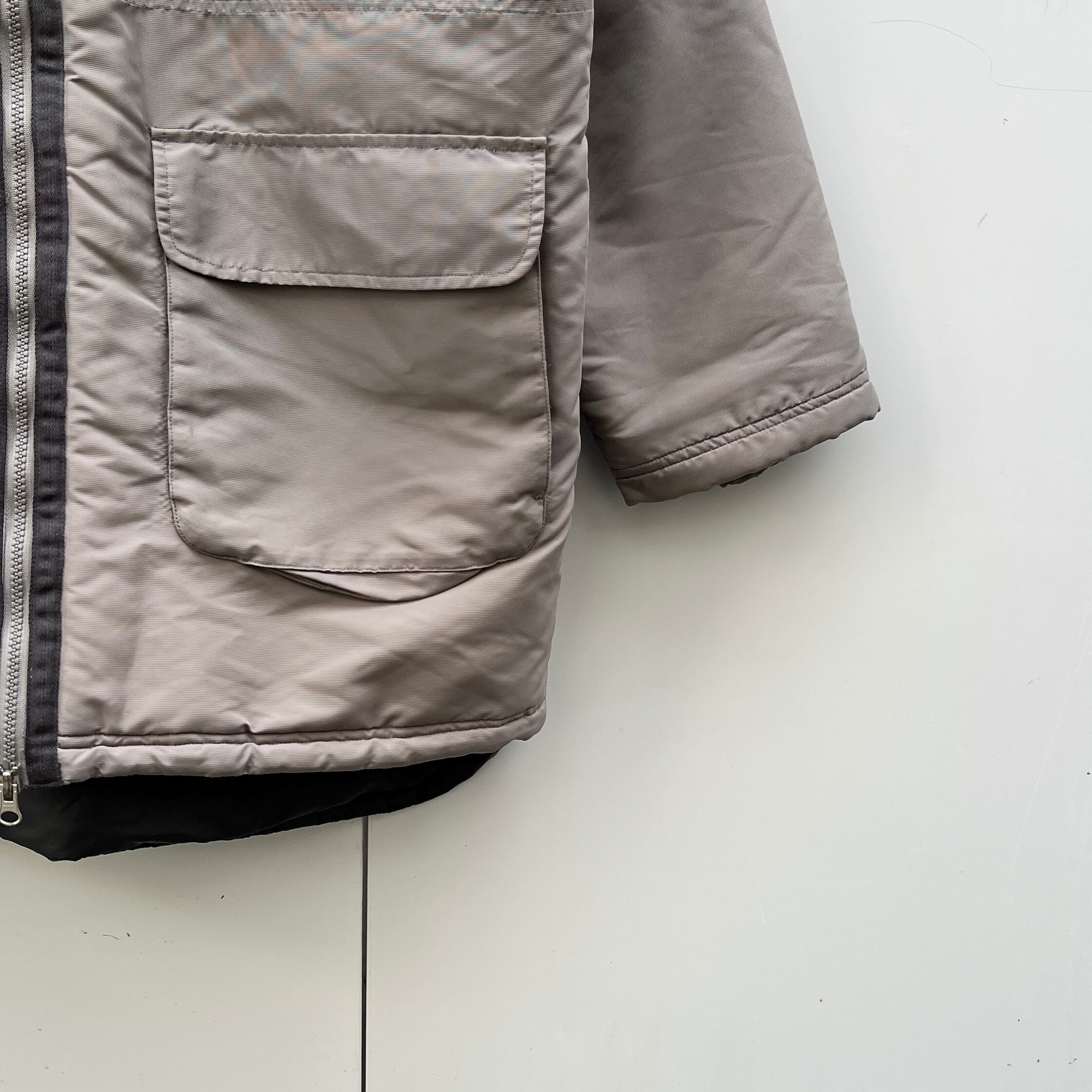 グレーのナイロン素材、左胸のフラップポケットにスウォッシュ刺繍、フロントに4つのフラップ付きポケット、ロゴ入りジッパースライダー、中綿入りの裏地が付いた防寒アウターのデザインです。