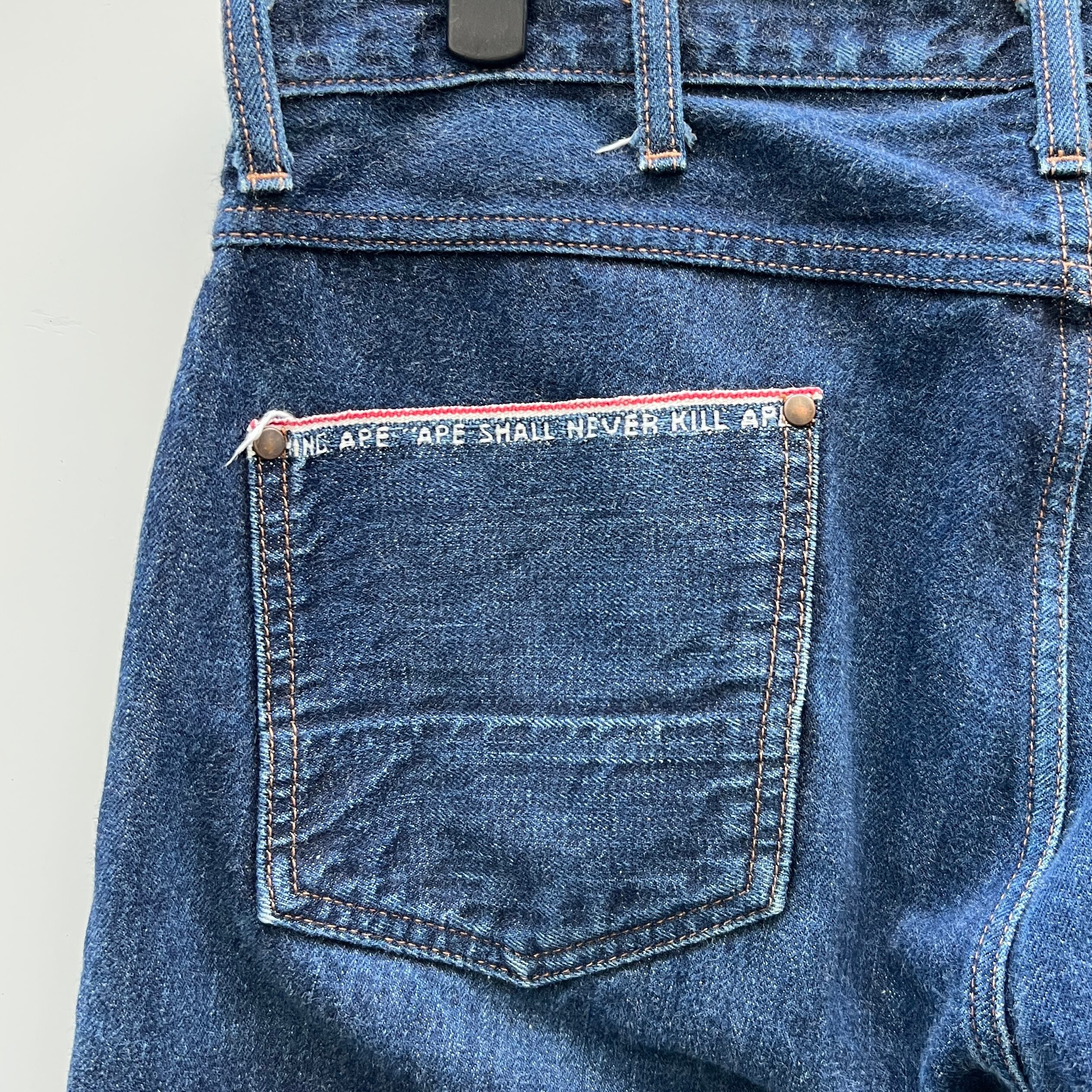 ウォッシュドブルーデニム、右バックポケットにレザーパッチ、上にBAPE and STUSSY刺繍、耳使いの左バックポケットとコインポケット、ロゴ入りボタン、APE SHALL NEVER KILL APE入り赤耳仕様のデザインです。