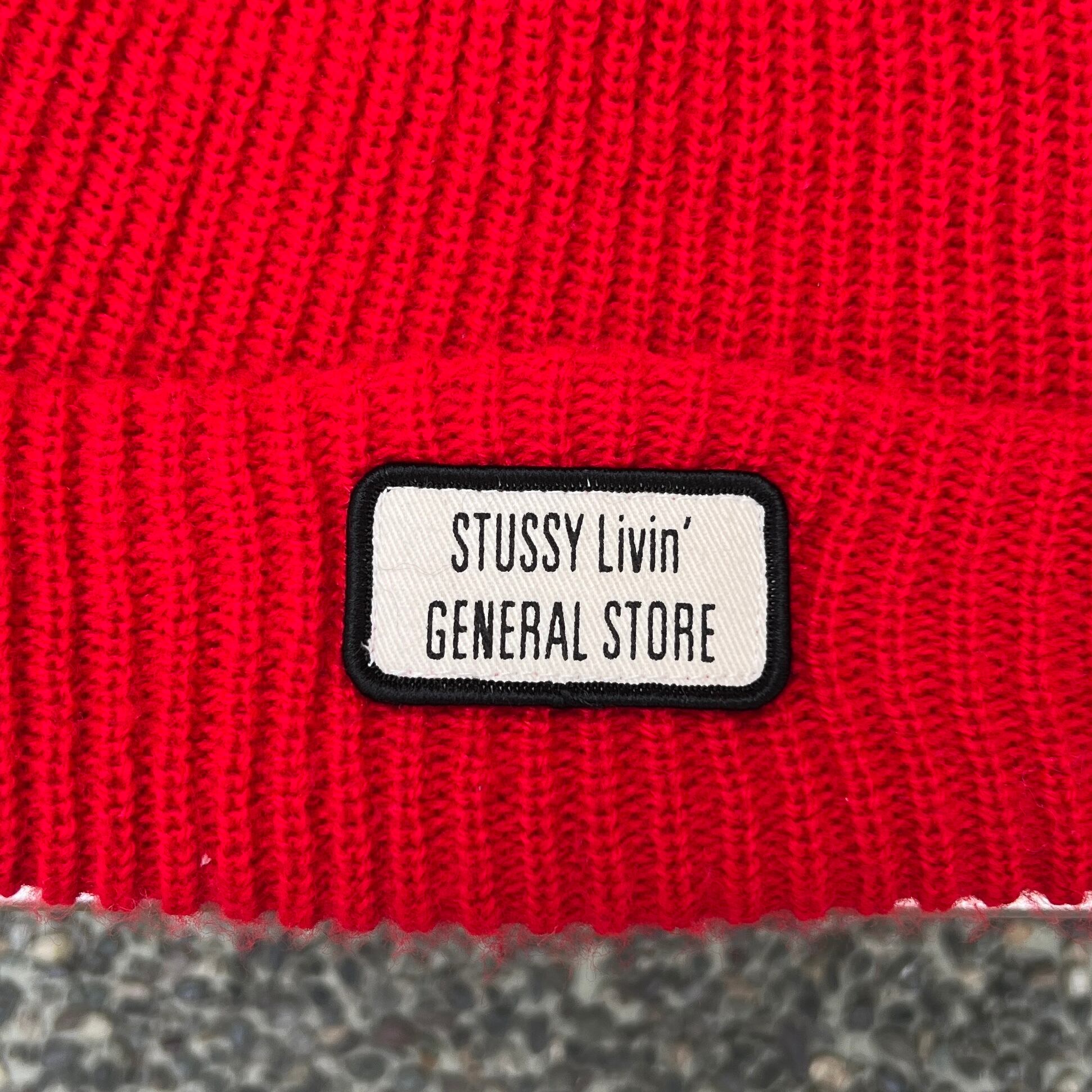 レッドのアクリル素材、フロントにSTUSSY Livin’ GENERAL STOREネームが付いたデザインです。