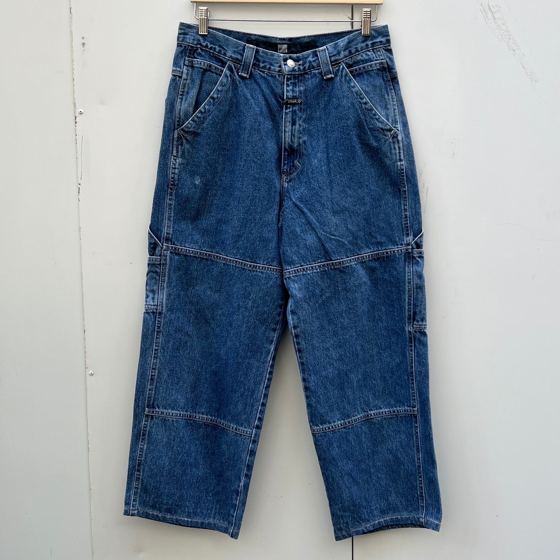 ウォッシュドブルーデニム、右バックポケットにネーム、フロントにロゴ入りボタン、その下にネーム、両サイドにポケットが付いたペインター型デザインです。