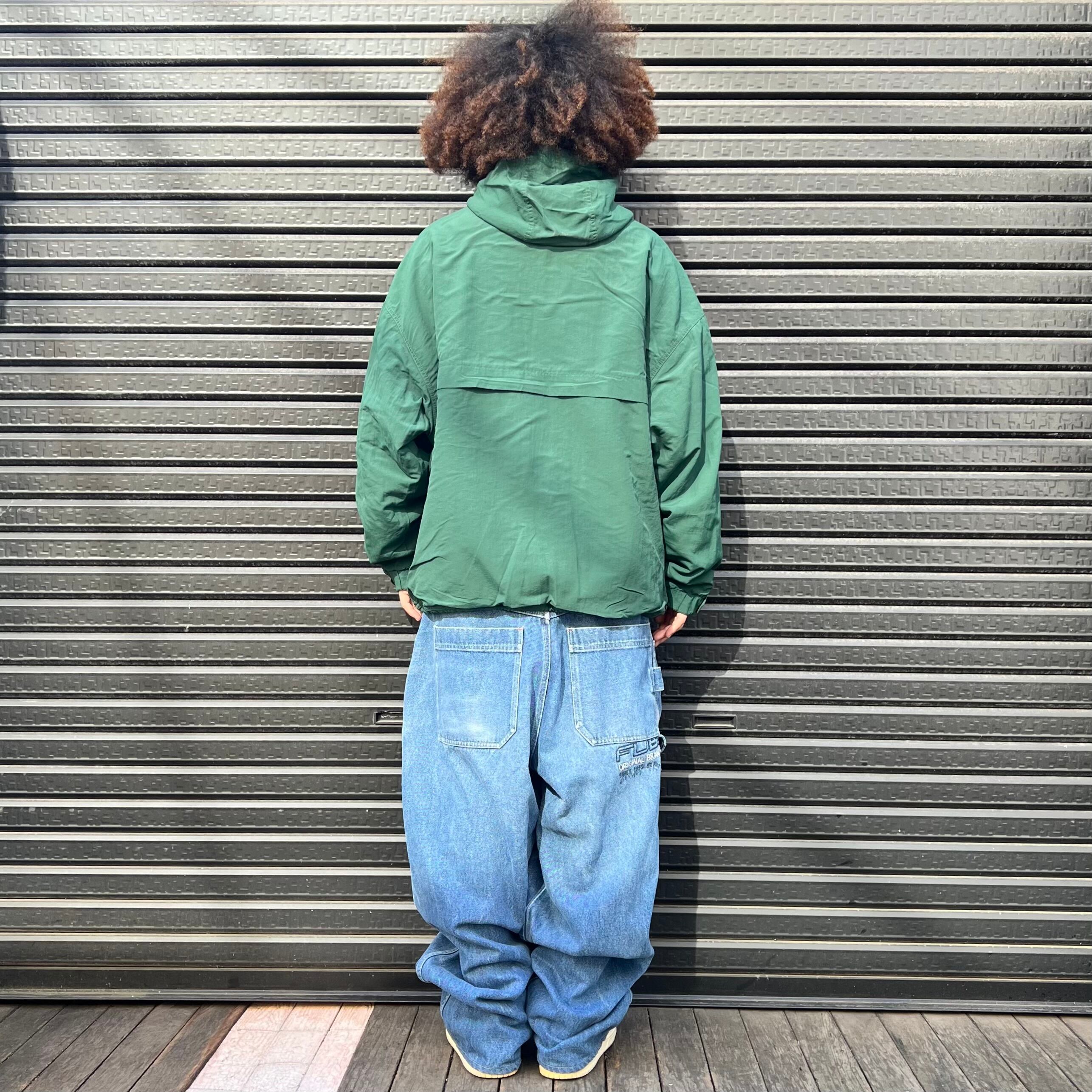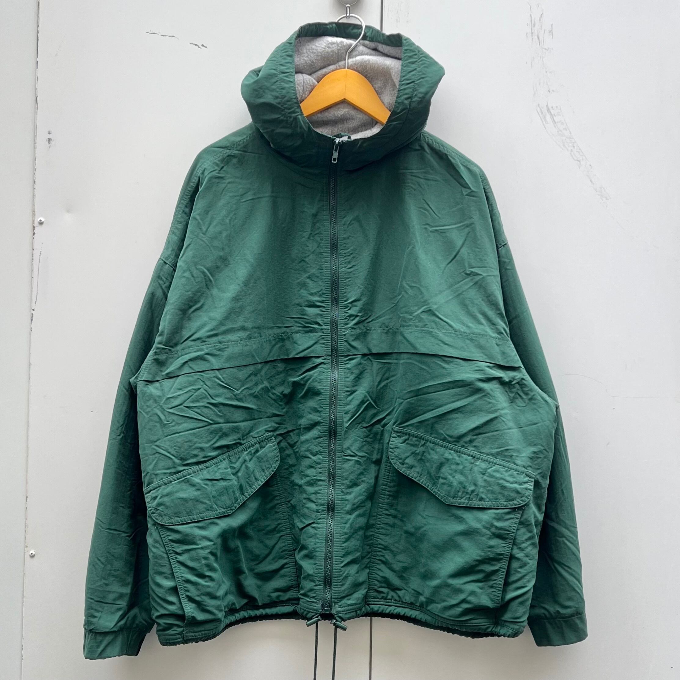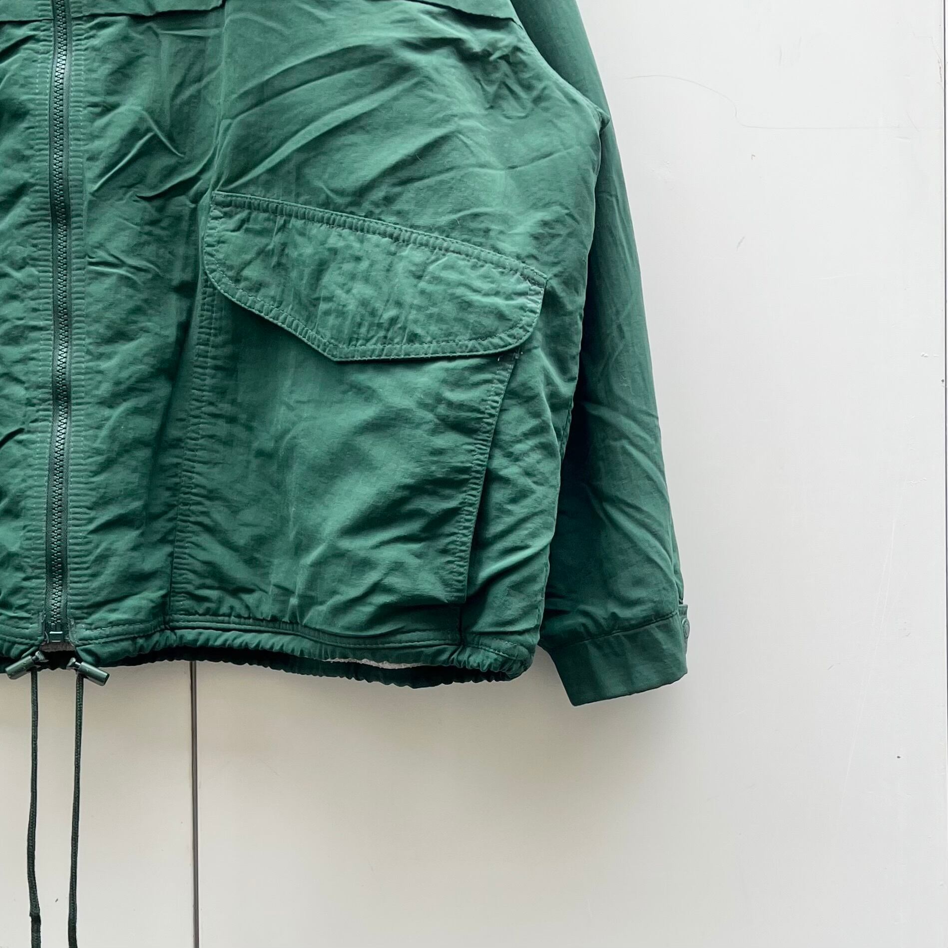 グリーンのナイロン素材xグレーフリース、フラップポケットとハンドウォームポケットのダブルポケット、裾、フードに紐入り、ロゴ入りスナップボタンを使用したデザインです。